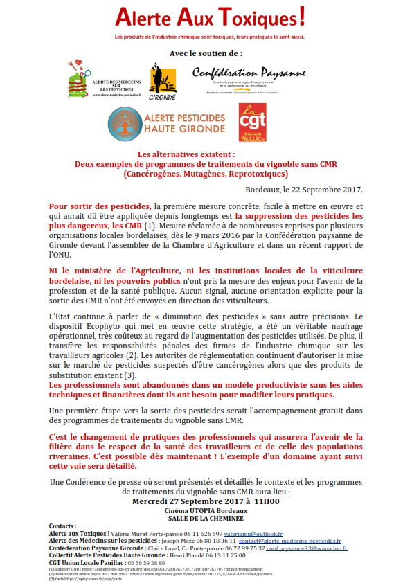 Alerte Pesticides Haute Gironde soutient la conférence de presse « Les alternatives existent : Deux exemples de programmes de traitements du vignoble sans CMR (Cancérogènes, Mutagènes, Reprotoxiques) » de l’association Alerte Aux Toxiques !