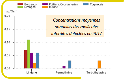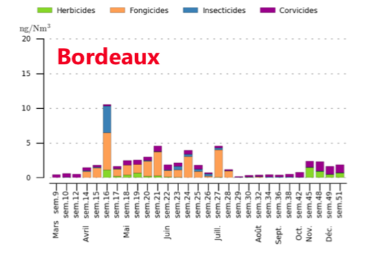 La comparaison entre ce qui est mesuré près des sites viticoles (St Estèphe, Cognac) avec ce qui est mesuré à Bordeaux-Centre donne une indication des dérives d’autant que les pesticides sont interdits d’utilisation par les collectivités territoriales depuis le 1er janvier 2017. Ce qui arrive sur Bordeaux ne peut venir que de l’Océan, ou du Médoc.