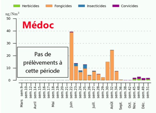 On voit sur les deux graphes ci-dessous comment les concentrations suivent le calendrier des traitements, avec un décalage dans le temps pour Bordeaux par rapport au Médoc (attention, les échelles verticales ne sont pas les mêmes).
