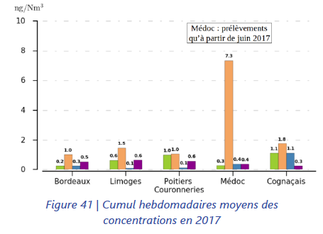 Les capteurs ne mesurent pas en permanence mais sur des périodes de 7 jours, et celui de St Estèphe n’était pas en fonctionnement en mars-avril-mai, ce qui fera bien sourire ceux qui connaissent l’état d’asphyxie dans le Médoc au printemps.