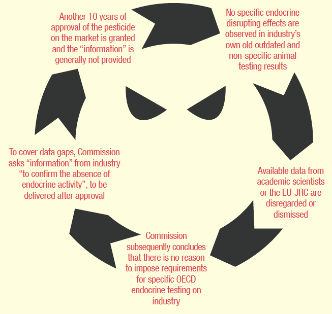 Pas d’effet PE spécifique observé dans les tests règlementaires de l’industrie, anciens et non-spécifiques d’une espèce animale > Les données spécifiques universitaires ou du Centre de Recherche européen sont ignorées > La commission en déduit qu’il n’y a aucune raison d’imposer des tests OCDE supplémentaires > Pour combler les lacunes, la commission demande des informations à l’industrie afin de « confirmer l’absence d’activité endocrinienne » ; l’approbation est donnée sans attendre ces informations > Dix nouvelles années d’homologation sont accordées et, dans la plupart des cas, les informations ne sont jamais fournies.