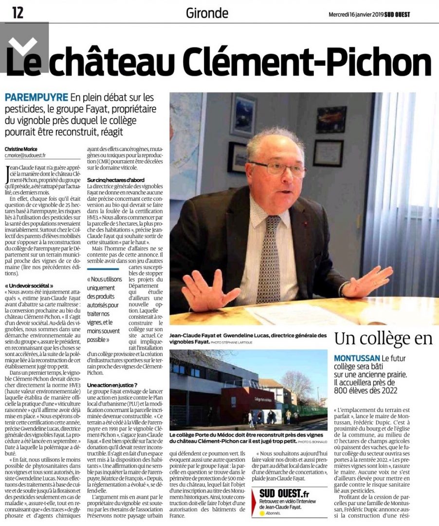 Ce mercredi 16 janvier, paraît dans le journal Sud-Ouest un article qui fera date dans le département : « Le château Clément-Pichon veut passer au bio ». Après des semaines de débat public (voir notre page presse-collège de Parempuyre) ce revirement est une très bonne nouvelle.