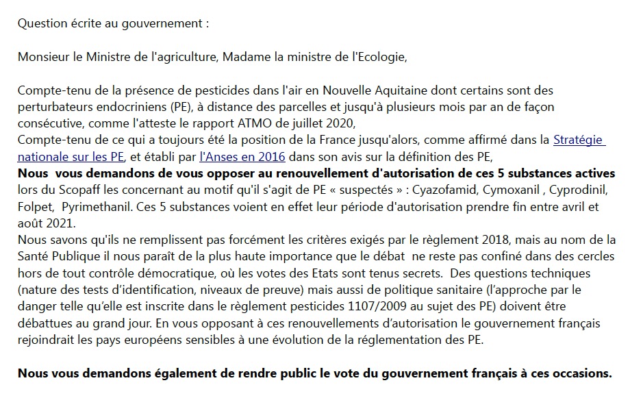 - une action européenne par rapport aux PE : les députés au parlement français et européen doivent demander au ministère de s’opposer au renouvellement d’autorisation de substances PE ne possédant pas tous les critères exigés par le règlement actuel (PE suspectés). De plus le vote des autorités françaises dans les instances européennes doit être rendu public afin que le débat sur l’identification des PE ne soit pas réduit à leur définition de 2018 et qu’il puisse s’ouvrir au niveau européen, au lieu de rester confiné dans des instances opaques.